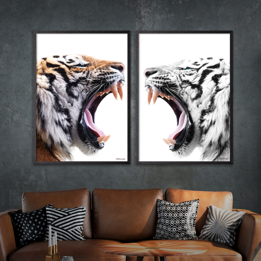Mød de smukke tiger motiver, som stråler intenst ansigt til ansigt. De smukke plakater med blå øjne, kan med fordel pynte i alle hjemmets rum. De stilfulde skandinaviske plakatmotiver skaber en helt unik atmosfære ved siden af hinanden, som de fortjener.